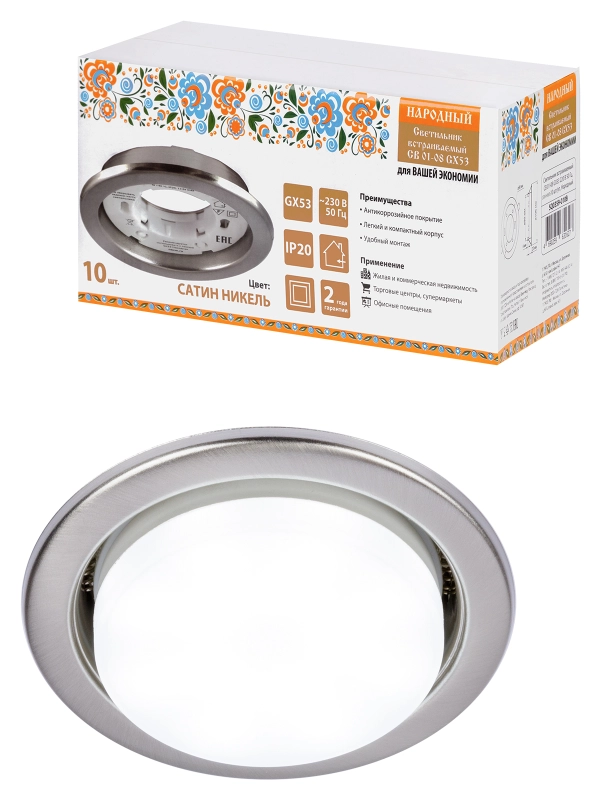 Светильник встраиваемый СВ 01-08 GX53 220 В 50 Гц, сатин никель, 10 шт/уп, Народный