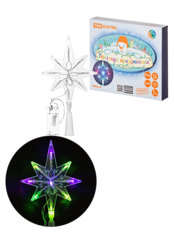 Декоративный элемент на ёлку светодиодный "Звезда" 9LED, 20см, мультиколор, 2хAA , TDM