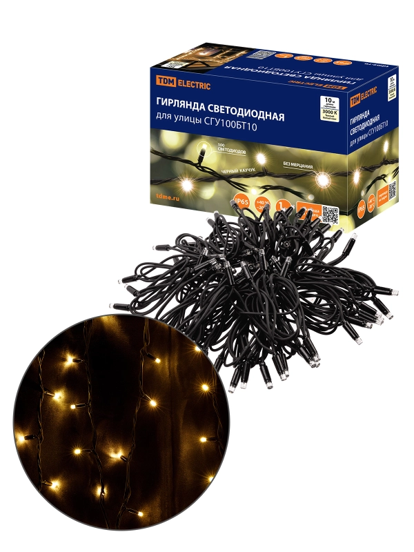 Гирлянда светодиодная СГУ100БТ10, 10м, 3000К, каучук чер., посл. подкл, IP65, 250 В, TDM