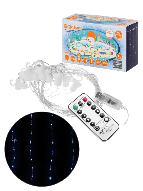 Гирлянда светодиодная "Роса - занавес" 2х2 м, 200LED, белый, ПДУ, USB, IP20, TDM