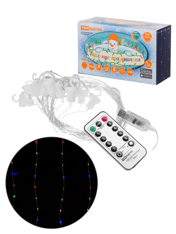 Гирлянда светодиодная "Роса - занавес" 2х2 м, 200LED, многоцветн., ПДУ, USB, IP20, TDM