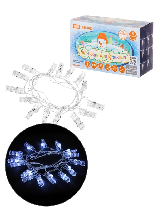 Гирлянда светодиодная "Прищепки" 3 м, 15LED, белый, 8 режимов, 250 В, IP20, TDM