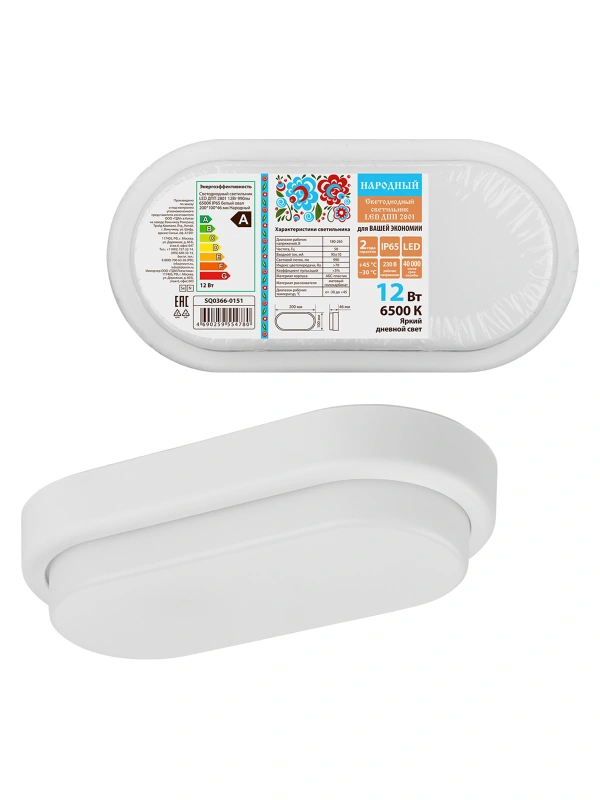 Светодиодный светильник LED ДПП 2801 12Вт 990лм 6500К IP65 белый овал 200*100*46 мм Народный