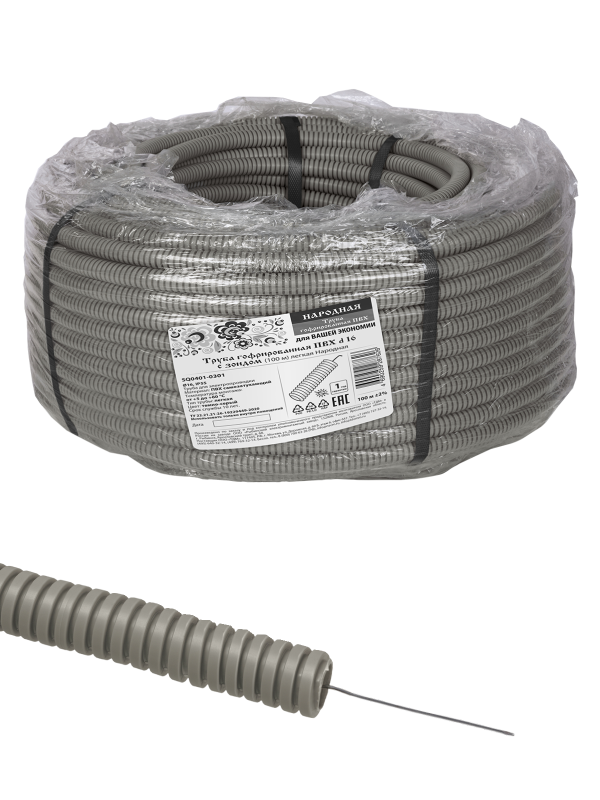 Труба гофрированная ПВХ d 16 с зондом (100 м) легкая Народная