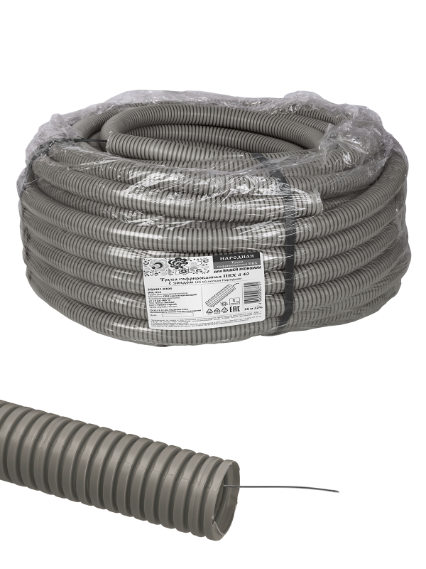 Труба гофрированная ПВХ d 40 с зондом (25 м) легкая Народная