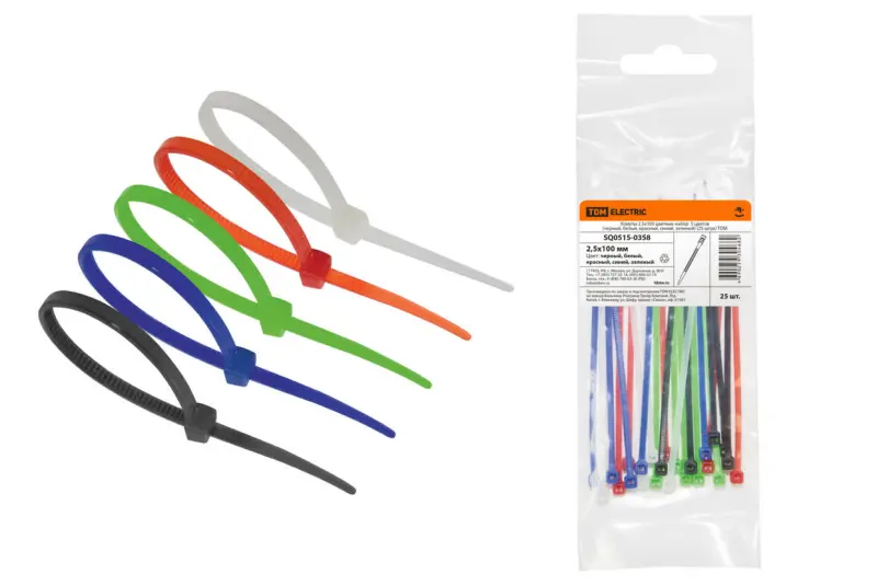 Хомуты 2,5х100 цветные набор 5 цветов (черный, белый, красный, синий, зеленый) (25 штук) TDM