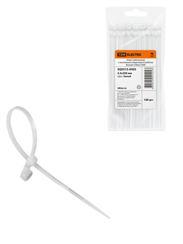 Хомут нейлоновый с монтажным отверстием 4,3х200 мм (белый) (100шт) TDM