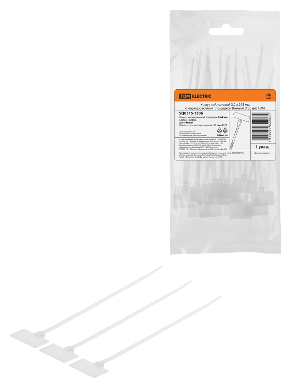 Хомут нейлоновый 3,2 х 215 мм с маркировочной площадкой (белый) (100 шт) TDM