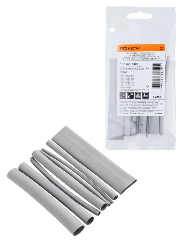 Набор трубок термоусаживаемых, не поддерживающих горение, клеевых, 8 типоразмеров, длиной 10 см ТТкНГ(3:1) "Моноцвет-диапазон, серый TDM"