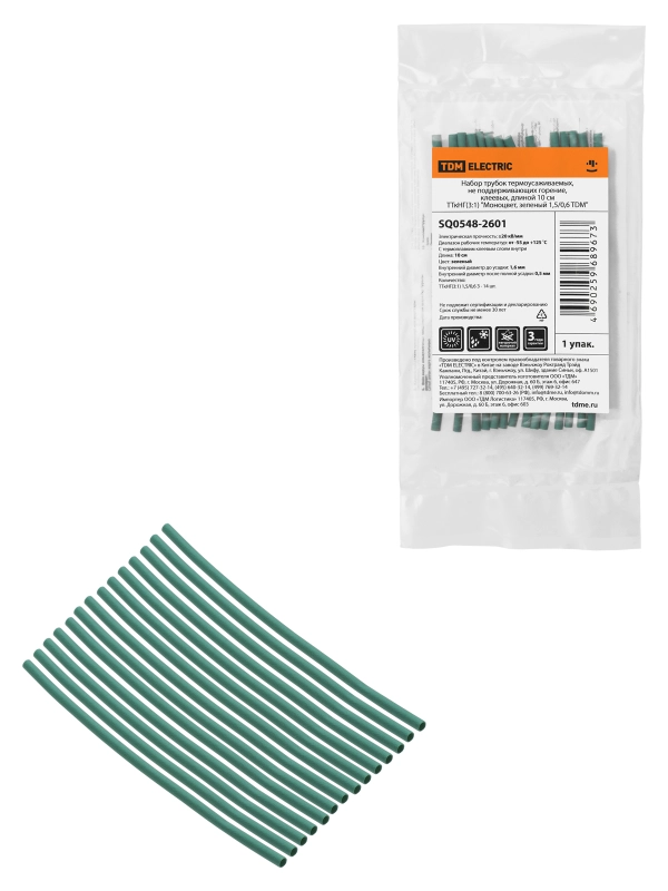 Набор трубок термоусаживаемых, не поддерживающих горение, клеевых, длиной 10 см ТТкНГ(3:1) "Моноцвет, зеленый 1,5/0,6 TDM"