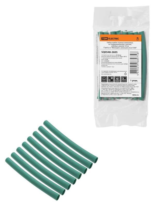 Набор трубок термоусаживаемых, не поддерживающих горение, клеевых, длиной 10 см ТТкНГ(3:1) "Моноцвет, зеленый 6,4/2,0 TDM"