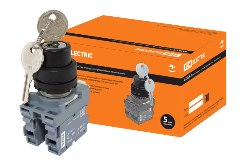 Переключатель с ключом на 2 положения с фиксацией M2SSК1-102 в сборе d22мм 1з+1р черный TDM