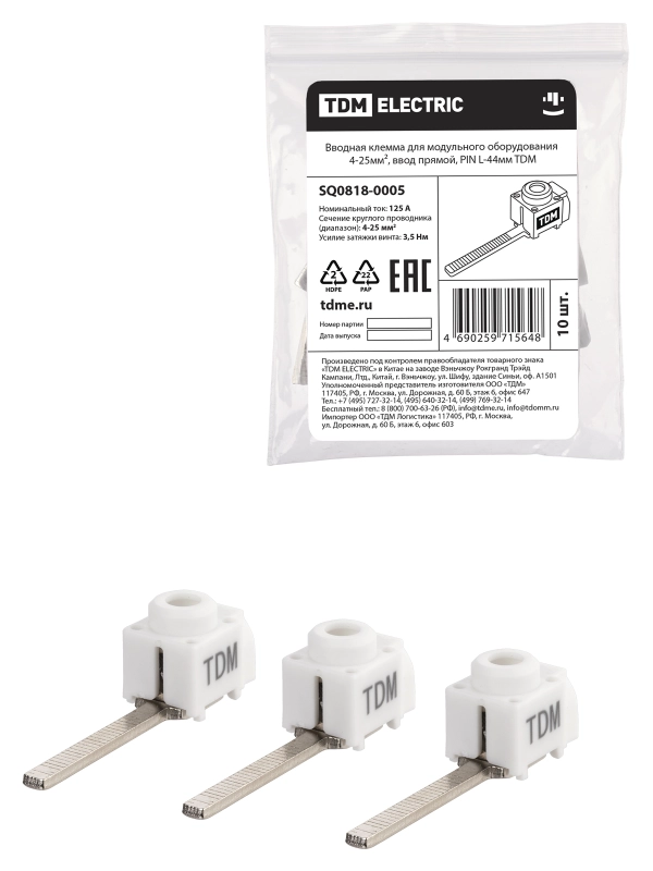 Вводная клемма для модульного оборудования изолированная, зажим винтовой 4-25мм?, прямая, 100А, ввод прямой, PIN L-44мм TDM