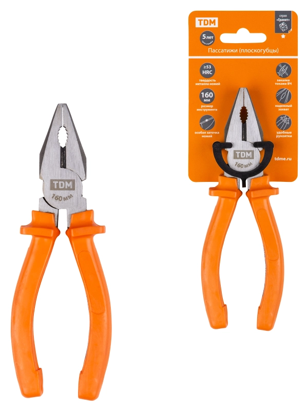Пассатижи (плоскогубцы), с пластиковыми рукоятками, углеродистая сталь, 160 мм, серия "Гранит" TDM