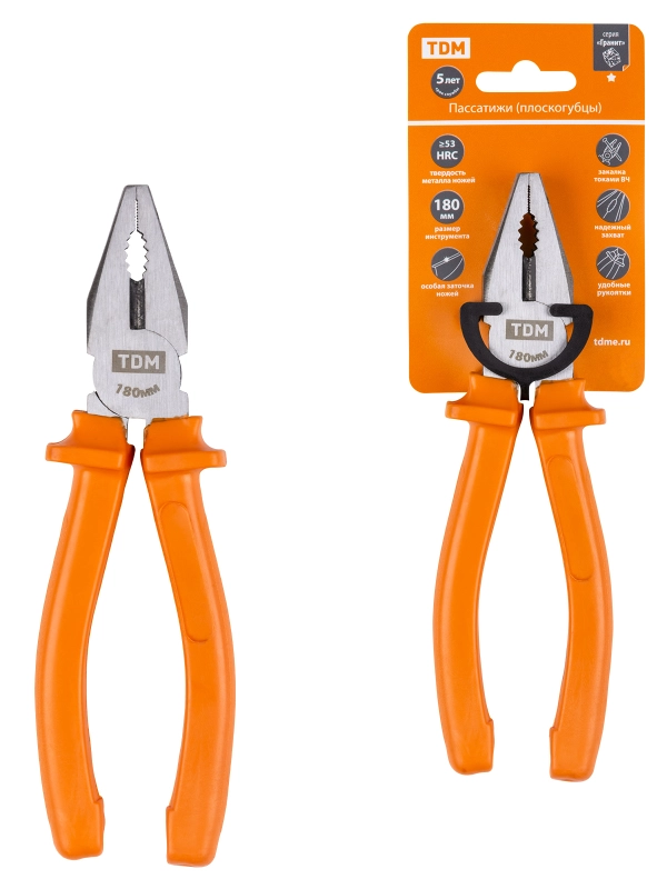 Пассатижи (плоскогубцы), с пластиковыми рукоятками, углеродистая сталь, 180 мм, серия "Гранит" TDM
