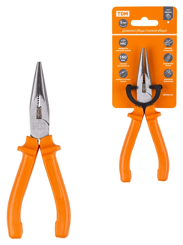 Длинногубцы (тонкогубцы), с пластиковыми рукоятками, углеродистая сталь, 160 мм, серия "Гранит" TDM
