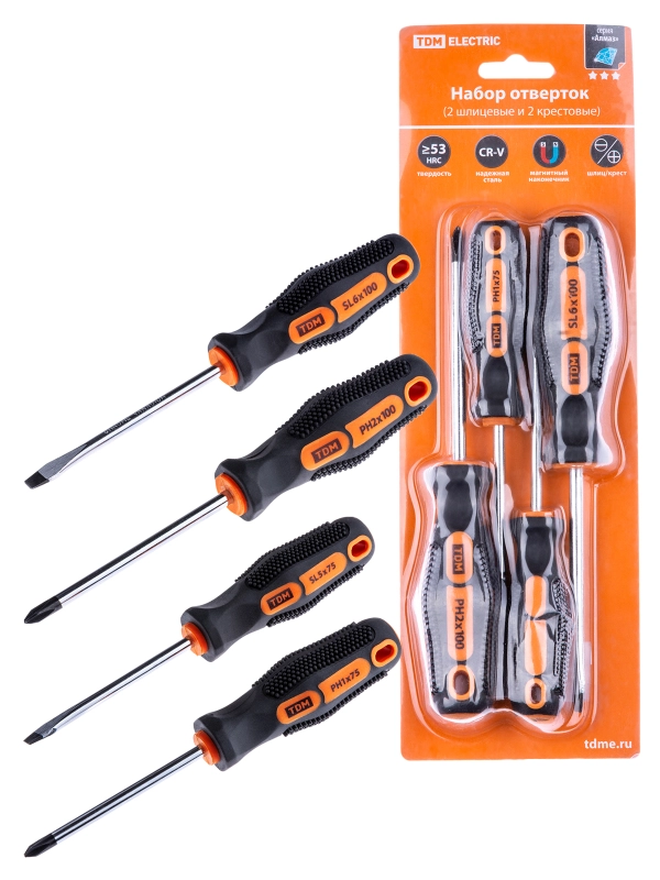 Набор отверток 4 шт.: SL5х75, SL6х100, PH1х75, PH2х100 (блистер), CR-V "Алмаз" TDM