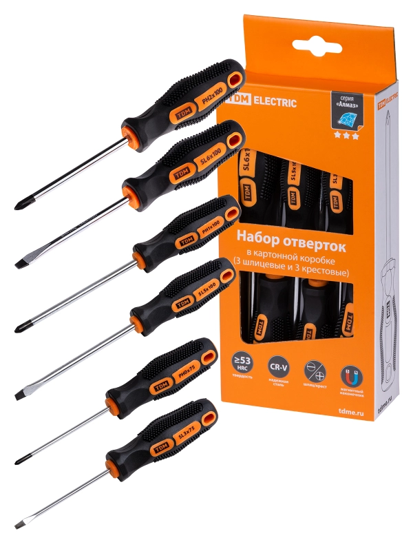 Набор отверток 6 шт.: SL:3х75;5х100;6х100, PH:0х75;1х100;2х100 (карт. коробка), CR-V "Алмаз" TDM