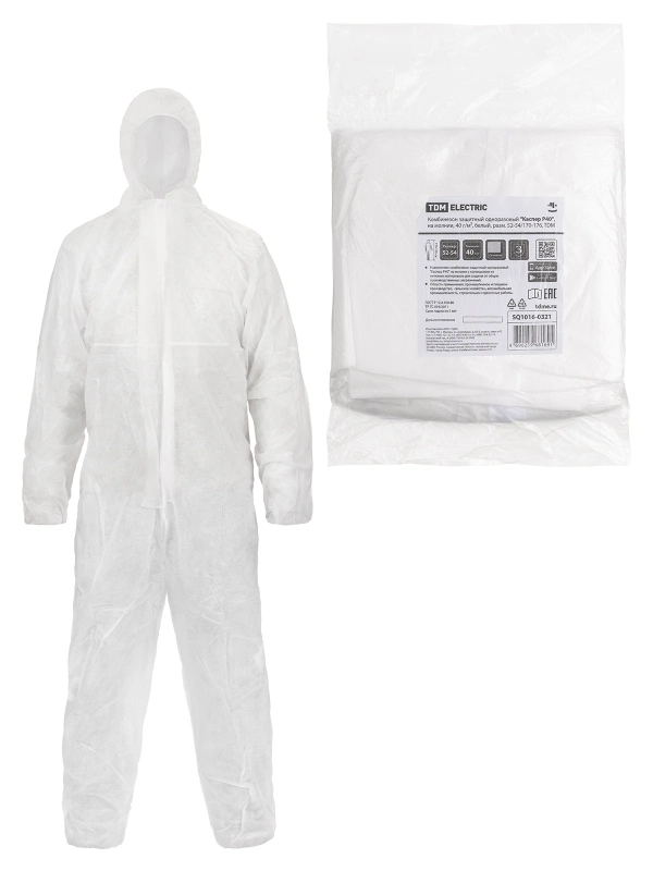 Комбинезон защитный одноразовый "Каспер Р40", на молнии, 40 г/м2, белый, разм. 52-54/170-176, TDM