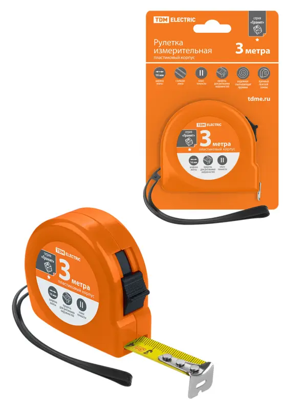 Рулетка, длина 3 м, стальная лента, ширина 16 мм, пластиковый корпус, "Гранит" TDM