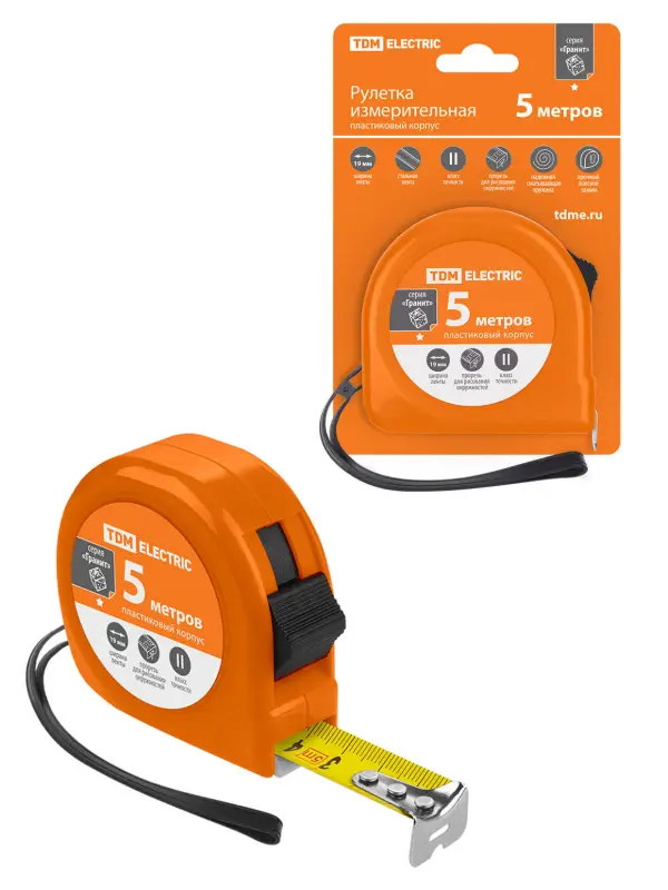 Рулетка, длина 5 м, стальная лента, ширина 19 мм, пластиковый корпус, "Гранит" TDM
