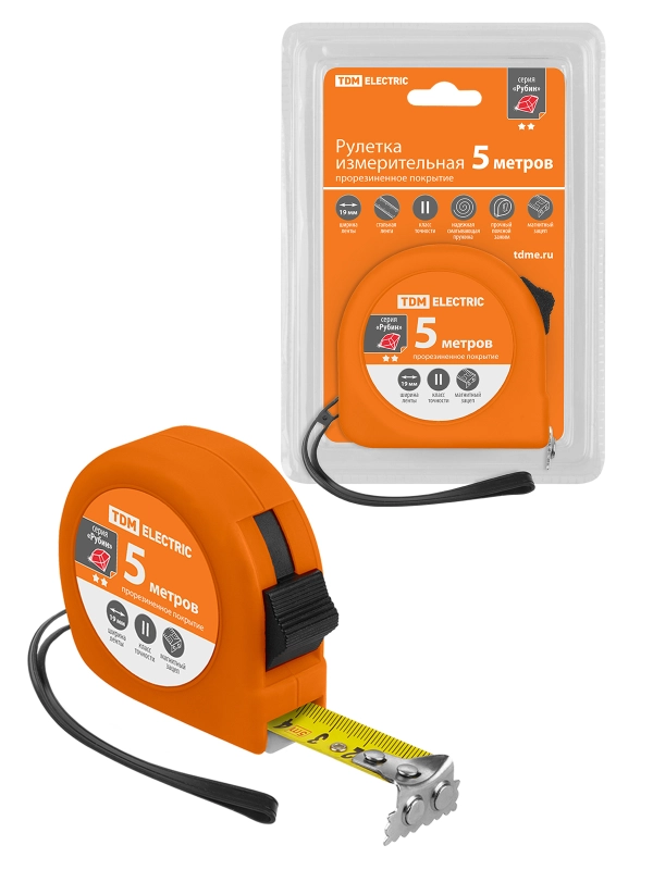 Рулетка, длина 5 м, стальная лента, ширина 19 мм, прорезиненное покрытие, магнит, "Рубин" TDM