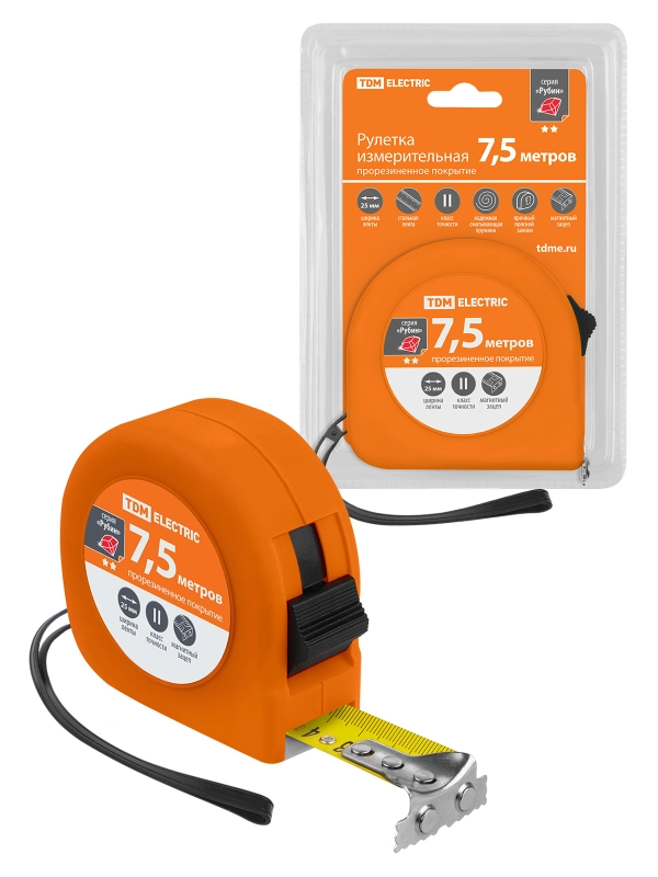 Рулетка, длина 7.5 м, стальная лента, ширина 25 мм, прорезиненное покрытие, магнит, "Рубин" TDM