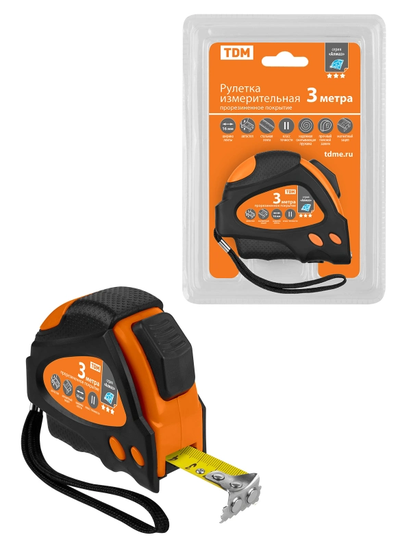 Рулетка 3 м х 16 мм, тройная фиксация, автостоп, обрезиненный корпус, магнит, "Алмаз" TDM