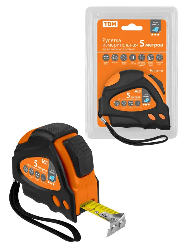 Рулетка 5 м х 19 мм, тройная фиксация, автостоп, обрезиненный корпус, магнит, "Алмаз" TDM