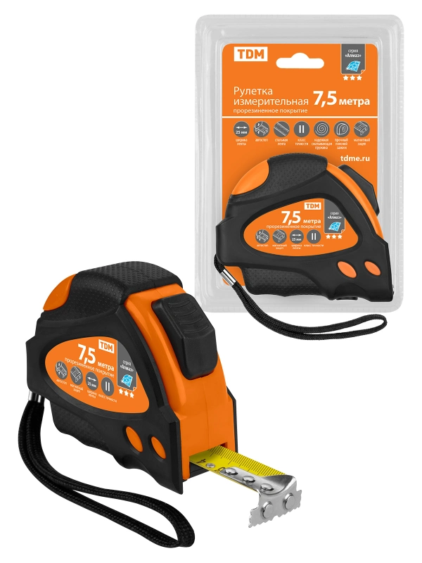 Рулетка 7,5 м х 25 мм, тройная фиксация, автостоп, обрезиненный корпус, магнит, "Алмаз" TDM