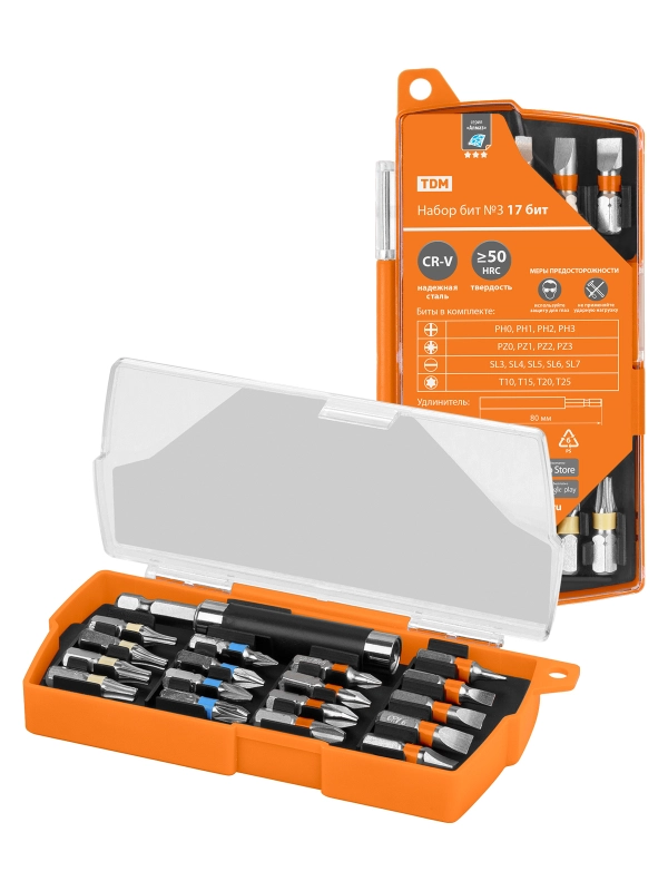 Набор бит №3, 17 бит: SL, PH, PZ, HEX, TORX, удлинитель, сталь CR-V, пластиковом держателе, «Алмаз»