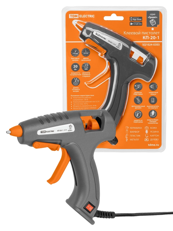 Клеевой пистолет КП-20-1, 7 мм, подставка, выключатель, шнур 1,3 м, 20 Вт, Т=220 С "Гранит" TDM