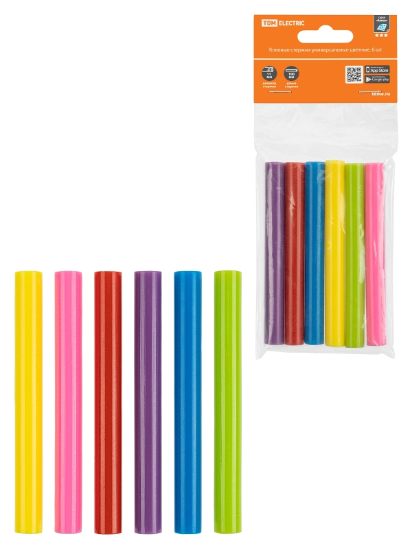 Клеевые стержни универсальные цветные, 11 мм x 100 мм, набор 6 шт, "Алмаз" TDM