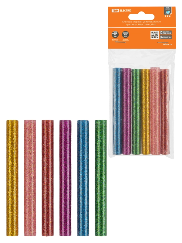 Клеевые стержни универсальные цветные с блестками, 11 мм x 100 мм, набор 6 шт, "Алмаз" TDM