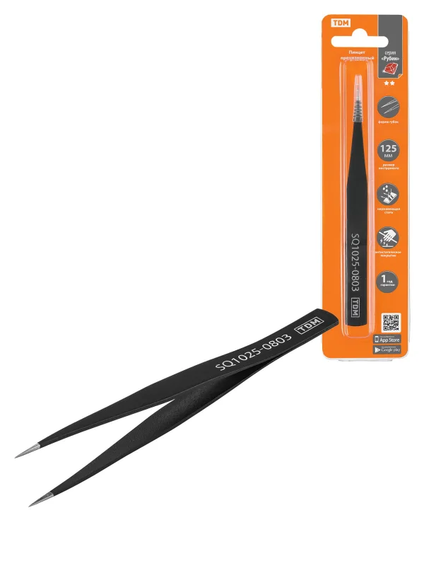 Пинцет прецизионный прямой 125 мм, острое жало, нерж., антистатич. покр., блистер, "Рубин" TDM
