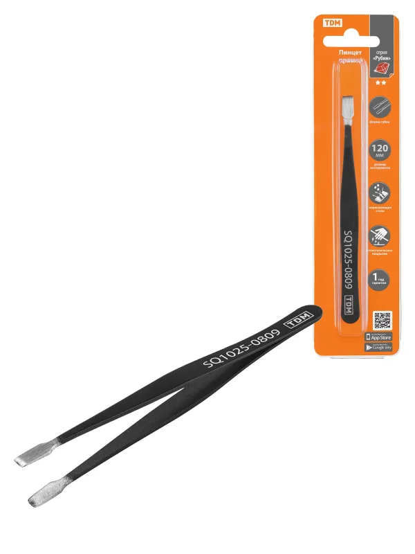 Пинцет прямой 120 мм, плоское жало 5 мм, нерж., антистатич. покр., блистер, "Рубин" TDM