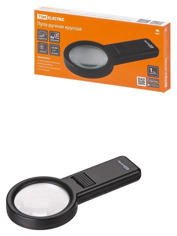 Лупа ручная круглая, d 68 мм, 6-ти крат. увел., LED подсветка, 2хАА, TDM