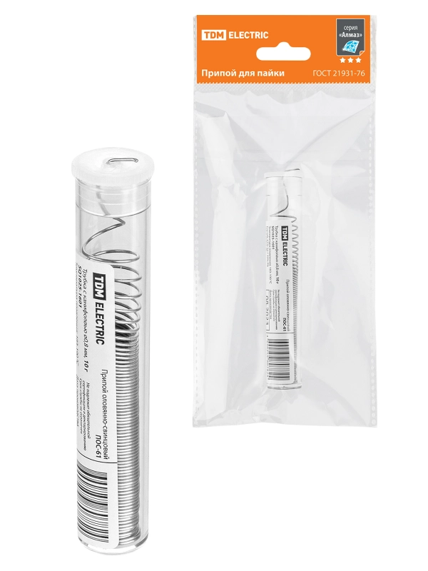 Припой ПОС 61, трубка с канифолью, ГОСТ 21931-76, ?0,8 мм, 10 г, колба, серия "Алмаз" TDM