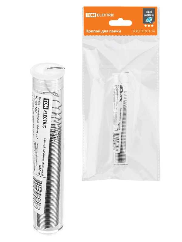Припой ПОС 40, трубка с канифолью, ГОСТ 21931-76, ?0,8 мм, 10 г, колба, серия "Алмаз" TDM