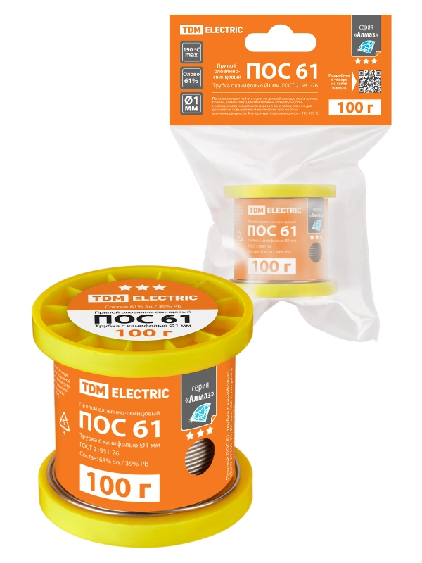 Припой ПОС 61, трубка с канифолью, ГОСТ 21931-76, ?1 мм, 100 г, катушка, инд. упак., "Алмаз" TDM