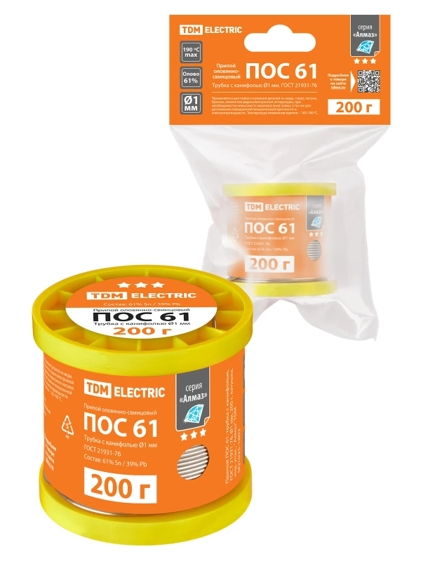 Припой ПОС 61, трубка с канифолью, ГОСТ 21931-76, ?1 мм, 200 г, катушка, инд. упак., "Алмаз" TDM