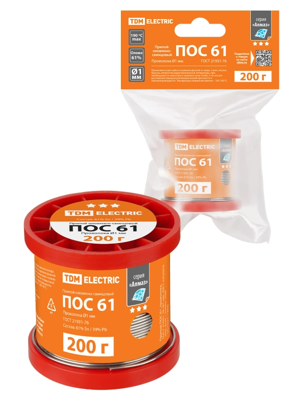 Припой ПОС 61, проволока, ГОСТ 21931-76, ?1 мм, 200 г, катушка, инд. упак., "Алмаз" TDM