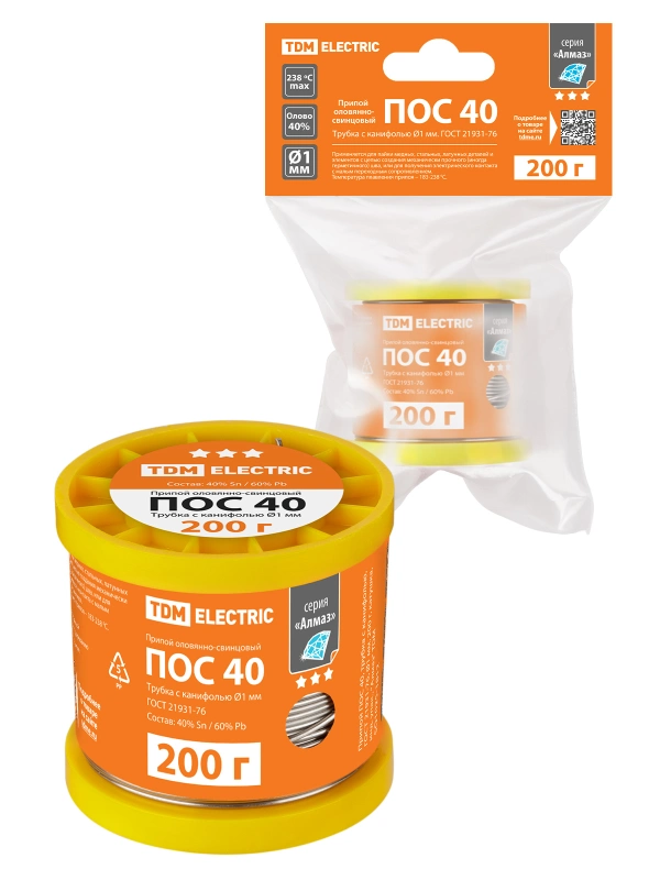 Припой ПОС 40, трубка с канифолью, ГОСТ 21931-76, ?1 мм, 200 г, катушка, инд. упак., "Алмаз" TDM