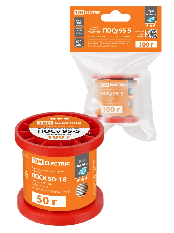 Припой ПОСу 95-5, проволока, ГОСТ 21931-76, ?1 мм, 100 г, катушка, инд. упак., "Алмаз" TDM