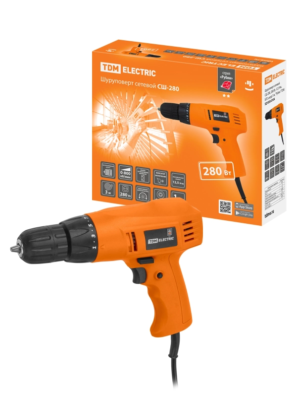 Шуруповерт сетевой СШ-280, 280 Вт, 12.5 Нм, БЗП, шнур 3 м, "Рубин" TDM