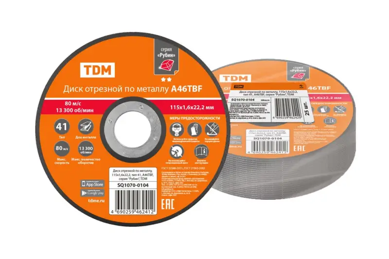 Диск отрезной по металлу, 115х1,6х22,2, тип 41, A46TBF, серия "Рубин", TDM