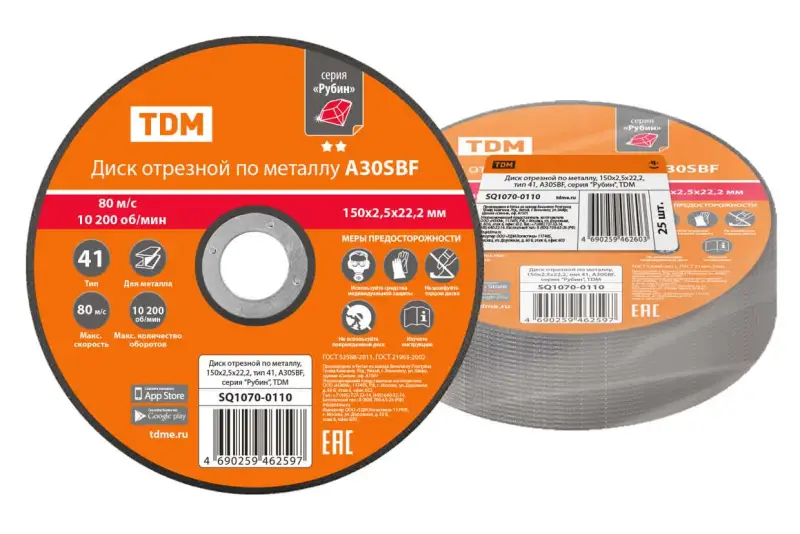 Диск отрезной по металлу, 150х2,5х22,2, тип 41, A30SBF, серия "Рубин", TDM