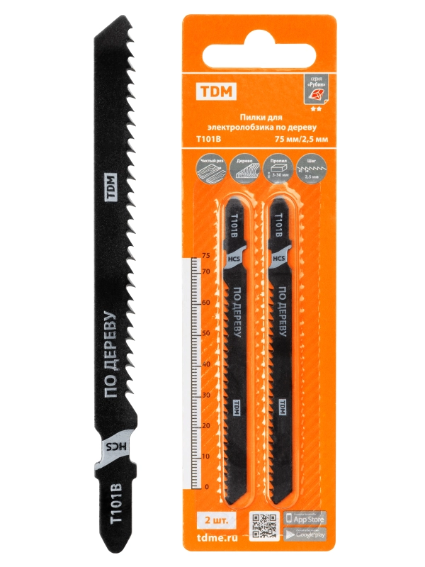 Пилки для электролобзика по дереву, HCS, 75х2,5 мм, чистый рез, T101B, 2 шт, "Рубин", TDM
