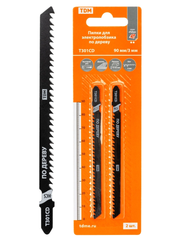 Пилки для электролобзика по дереву, HCS, 90х3 мм, быстрый рез, T301CD, 2 шт, "Рубин", TDM