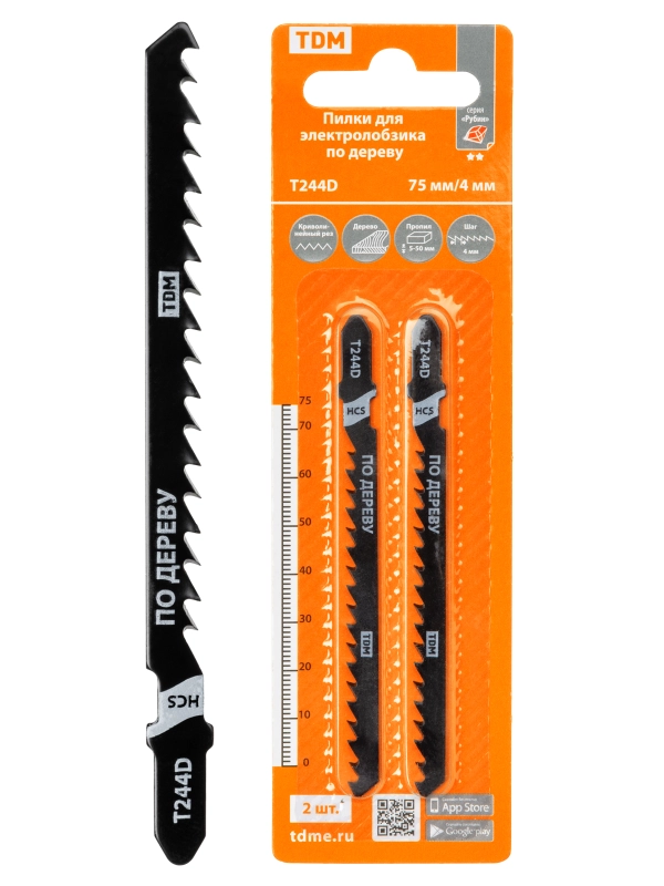 Пилки для электролобзика по дереву, HCS, 75х4 мм, криволинейный рез, T244D, 2 шт, "Рубин", TDM